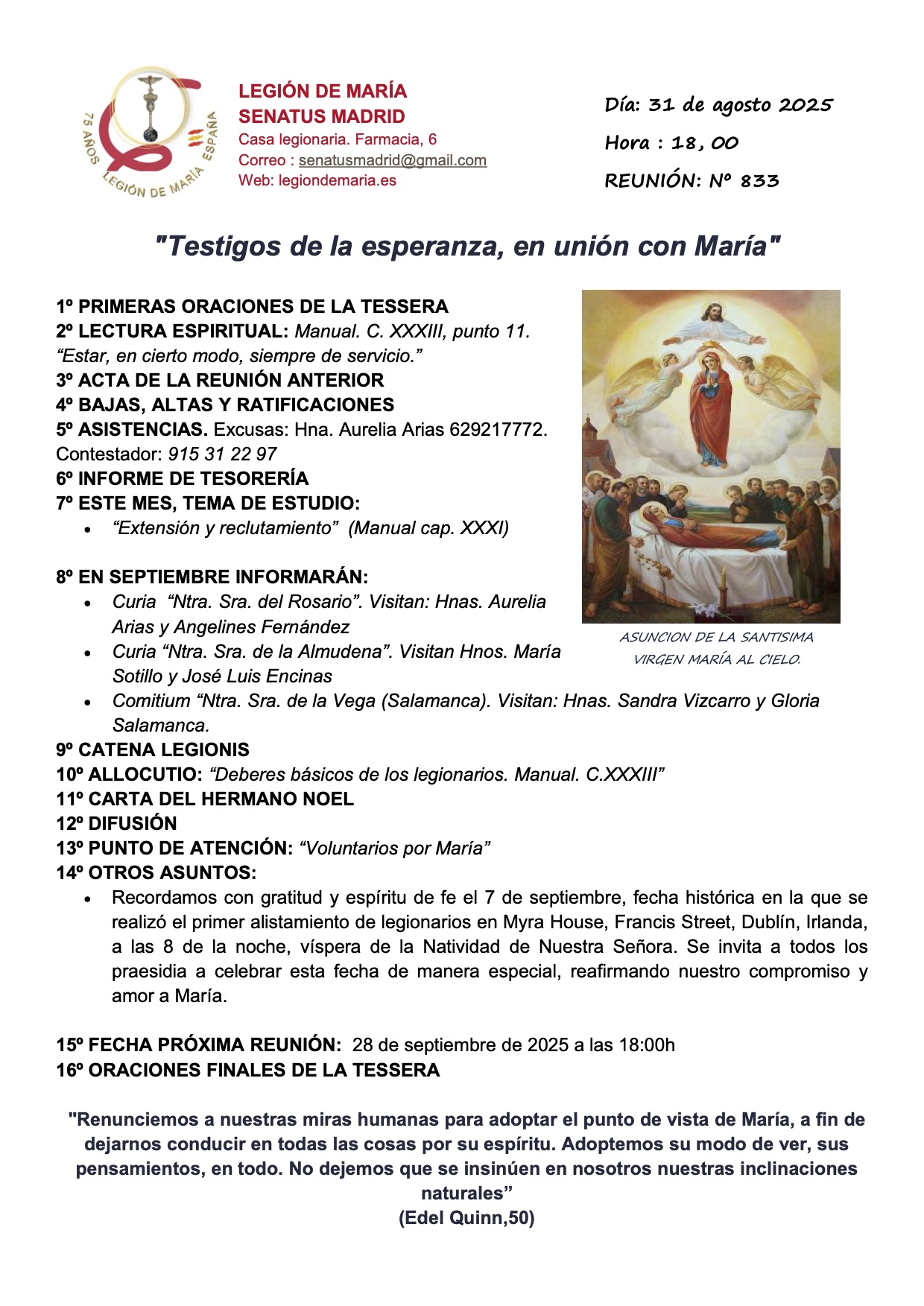 AQUÍ podéis consultar la agenda correspondiente al mes de junio. En ella encontraréis los detalles y puntos importantes a tratar en nuestra próxima reunión, que será el 31 de agosto. Como siempre, este encuentro será una oportunidad para compartir, reflexionar y seguir fortaleciendo nuestra misión.